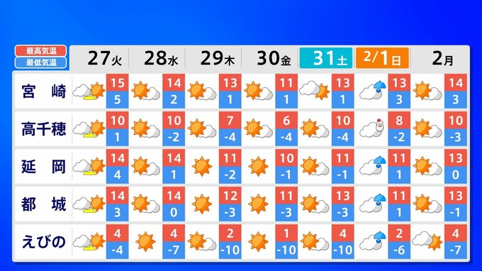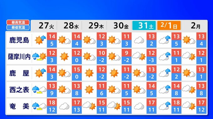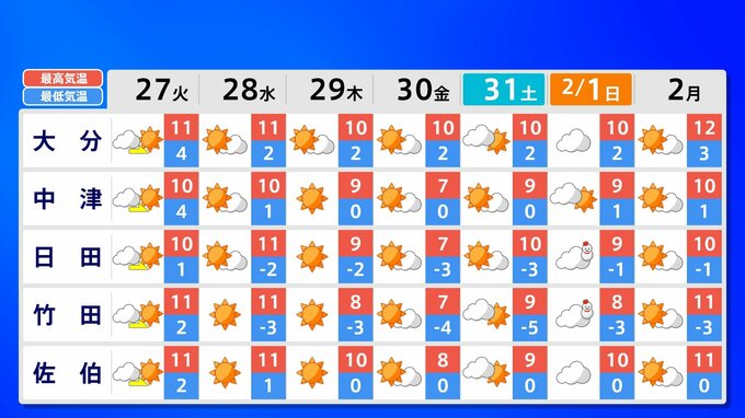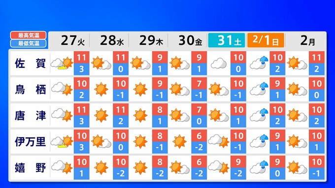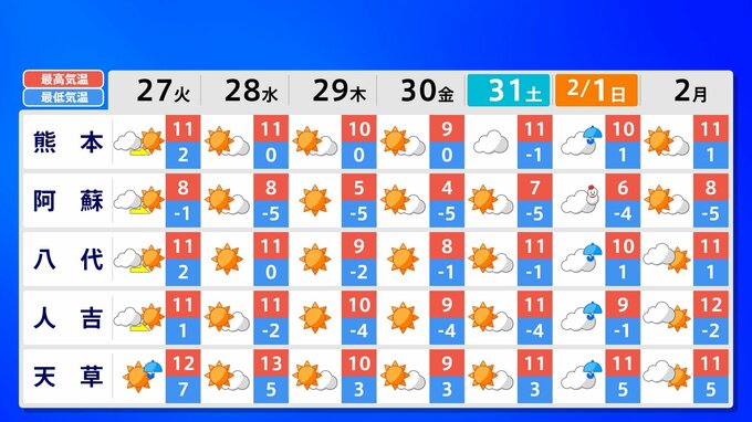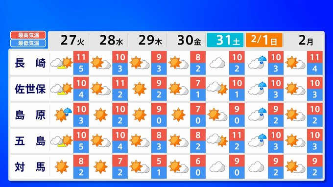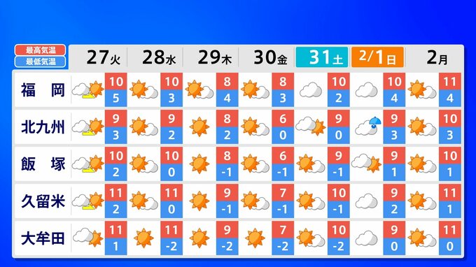 九州地方各都市の週間予報(27日(火)~ 2月2日(月))