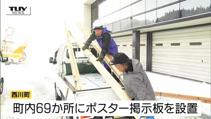真冬の選挙戦となる中、西川町ではきょう午前8時から町内69か所に選挙ポスターの掲示板を設置する作業が行われました。