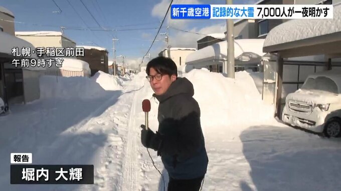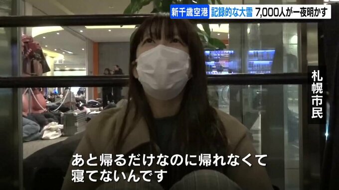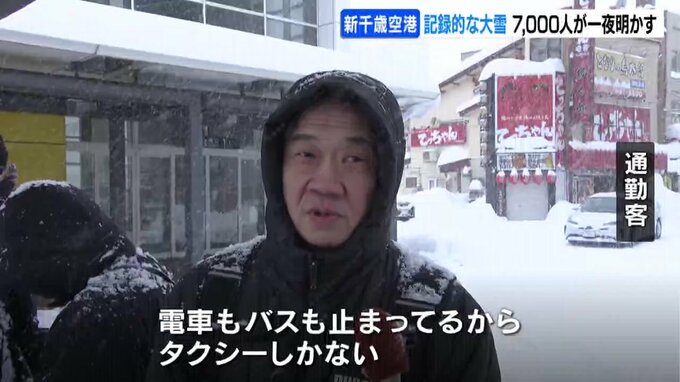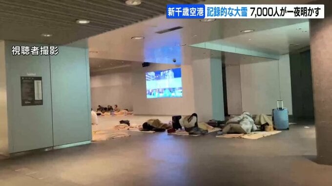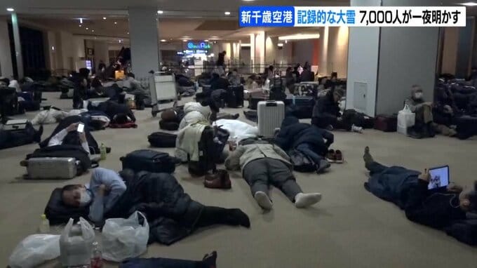 この大雪の影響で、新千歳空港では札幌方面に向かう鉄道やバスが運休し、乗客ら約7000人が空港で一夜を明かしました。