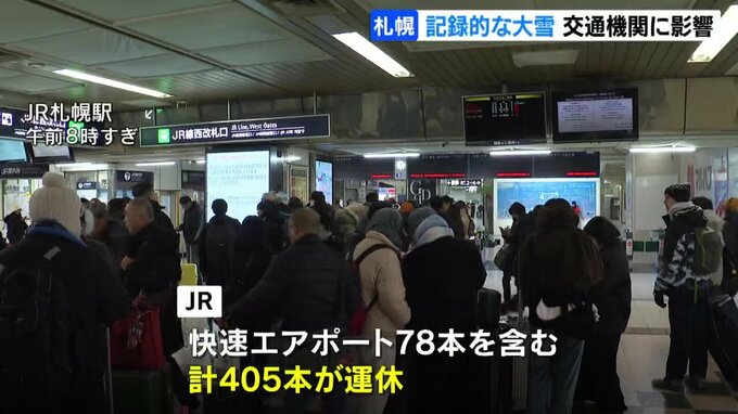 JR北海道によりますと、除雪作業の影響などで快速エアポート78本を含む、合わせて405本の列車が運休しています。