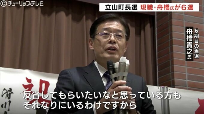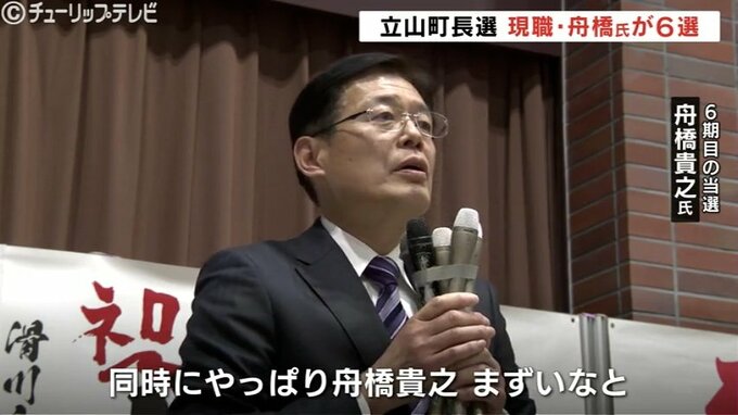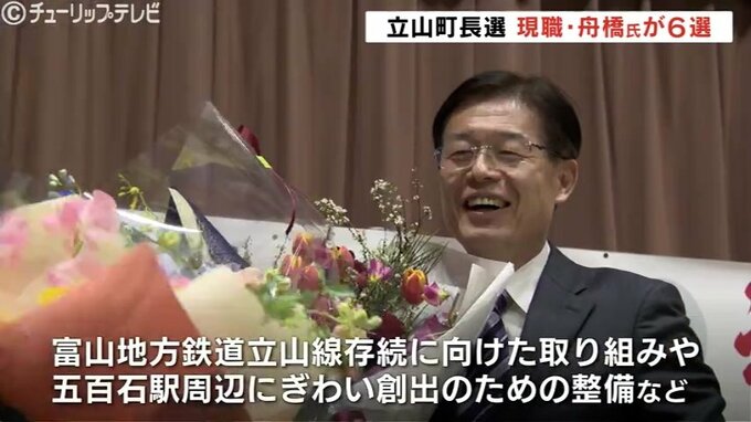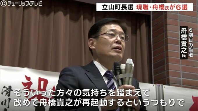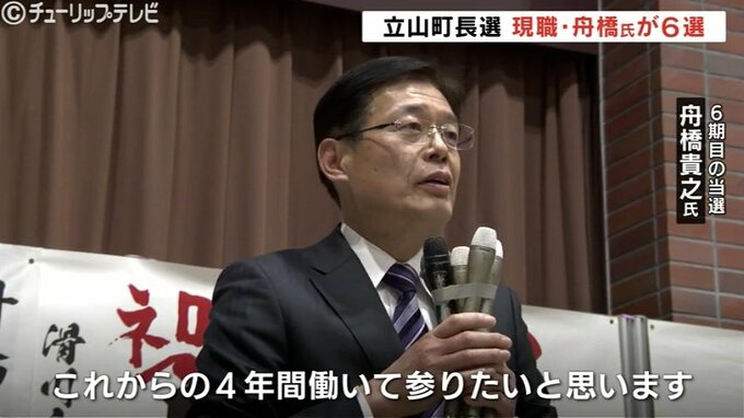 任期満了に伴う立山町長選挙は25日に投開票が行われ現職の舟橋貴之氏が6期目の当選を果たしました。
