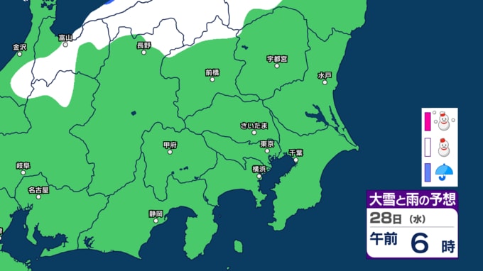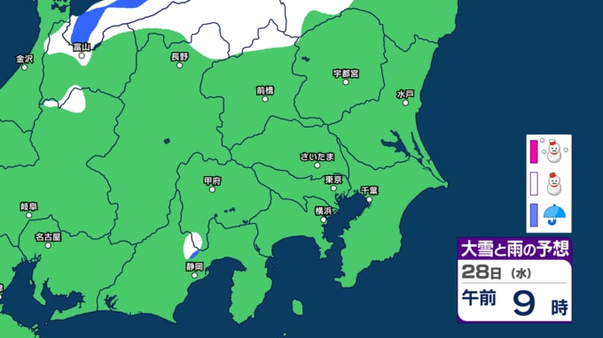 画像で掲載している31日までの雪シミュレーションでは、28日(水)は山梨、静岡、神奈川の県境で雪が予想されています。長野や群馬など関東地方北部の一部でも雪が予想されています。