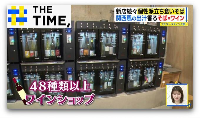 店の2階には48種類以上のワインを1杯ずつ試せるディスペンサーがあり、専用のコインを購入すれば好きなものを味わえ、ワインを“そばの出汁”で割った「出汁割りワイン」(660円)も人気です。