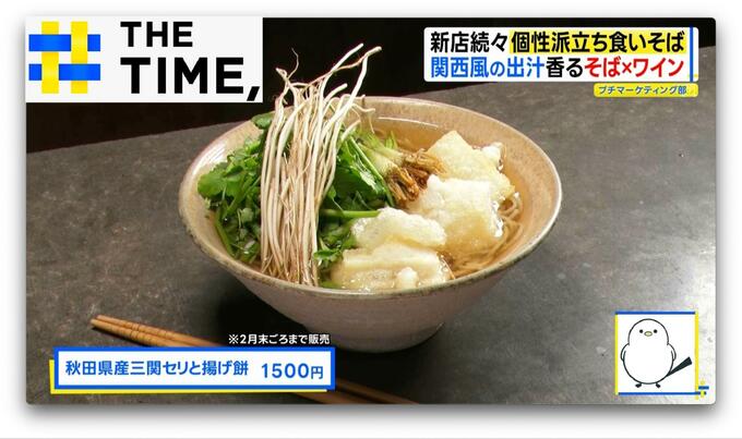 冬が旬の「セリ」の葉や茎、根っこがたっぷりのった「秋田県産三関セリと揚げ餅蕎麦」(1500円※2月末ごろまで販売)は、利尻昆布や本鰹などを使った関西風の出汁がまろやかで、優しい味わいの一杯です。