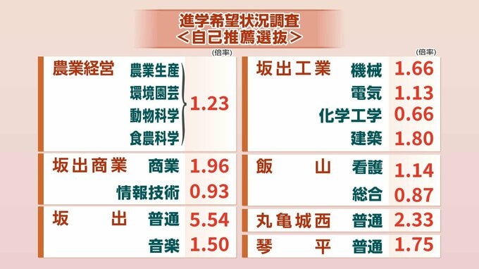 【速報】令和8年度 香川県公立高校 自己推薦選抜 出願者数発表 坂出(普通)最大5.54倍、観音寺第一(普通・理数)2.12倍【26日香川県教育委員会】 RSK山陽放送 2026年1月26日(月) 15:34 国内 農業経営・坂出商業・坂出・坂出工業・飯山・丸亀城西・琴平 坂出の普通は11人以内の募集定員に対して61人が出願しています。坂出工業の建築は15人以内の募集定員に対して27人が出願しています。【画像③】 【画像③】令和8年度 香川県公立高校 自己推薦選抜 出願者数