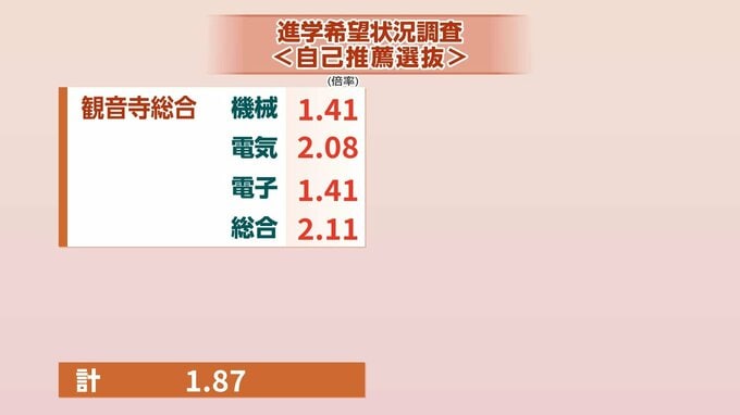【速報】令和8年度 香川県公立高校 自己推薦選抜 出願者数発表 坂出(普通)最大5.54倍、観音寺第一(普通・理数)2.12倍【26日香川県教育委員会】 RSK山陽放送 2026年1月26日(月) 15:34 国内 観音寺総合 観音寺総合は電気が12人以内の募集定員に対して17人が出願、総合は59人以内の募集定員に対して125人が出願しています。【画像⑤】 【画像⑤】令和8年度 香川県公立高校 自己推薦選抜 出願者数