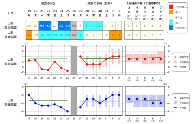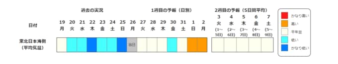 ・2週目の予報は中心の日に前後2日間を加えた5日間の平均(最高気温の5日間平均、最低気温の5日間平均、平均気温の5日間平均)です。平均期間を中心の日の下に表示しています。2週目のかなり高い(かなり低い)は、かなり高い(かなり低い)気温となる確率が30%以上のときに表示します。