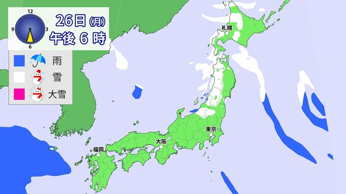 きょう26日(月)は一時的に雪がおさまっている所が多くなっています。