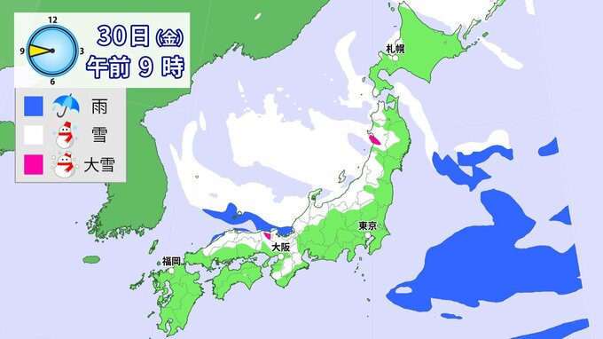 29日(木)~30日(金)は、上空約1500メートルでマイナス6℃以下(平地で雪が降る目安)の寒気が本州をすっぽりと覆うでしょう。