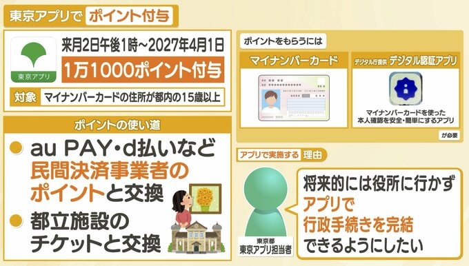 「東京アプリ」で、2月2日午後1時~2027年4月1日に1万1000ポイントが付与されます。