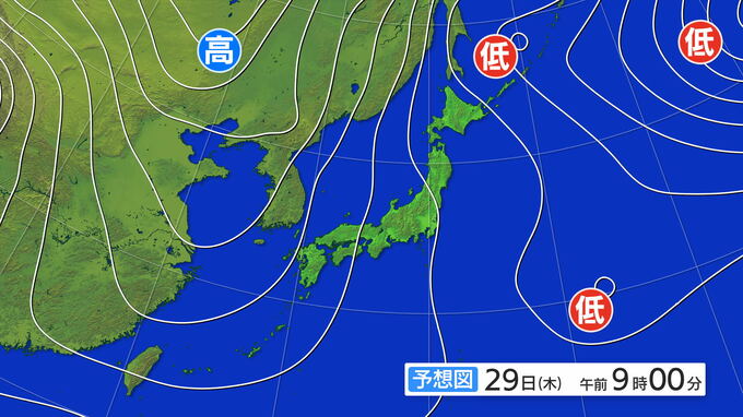 29日(木)午前9時の予想天気図です。いったん緩んだ冬型の気圧配置が戻ってくる見込みです。