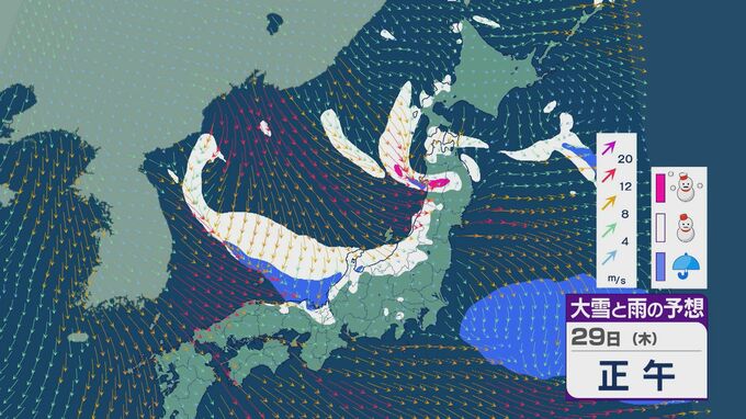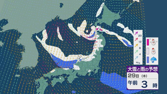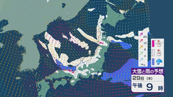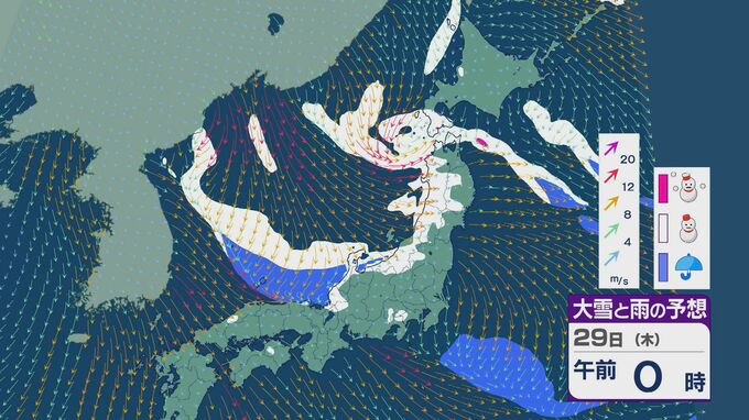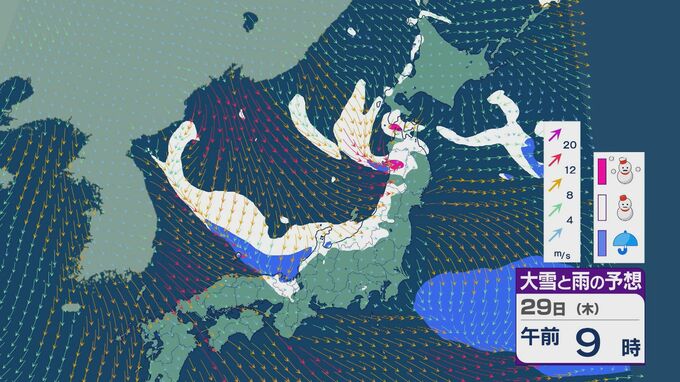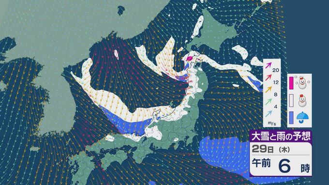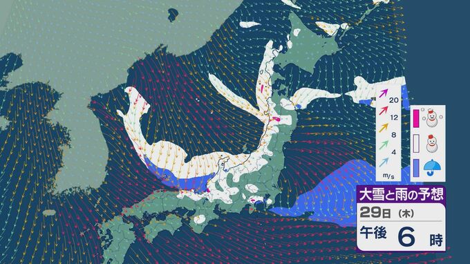 【今週の天気】28日(水)以降“冬型気圧配置”と“強い寒気”が再び 今週の後半にかけて日本海側の地域では積み重なる雪に注意・警戒を 雪と風シミュレーション 北陸放送 2026年1月26日(月) 18:01 国内 29日(木)の雪と風の予想ですが、発達した雪雲が山陰から北陸、東北の日本海側にかかりそうです。風が収束し発生する雪雲が流れ込むところでは大雪のおそれがあります。