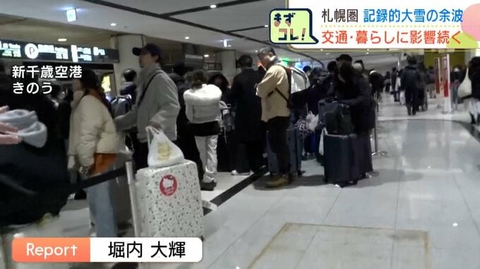 新千歳空港には25日、道外から大勢の乗客が到着したものの、札幌方面に向かう鉄道やバスは全面運休。