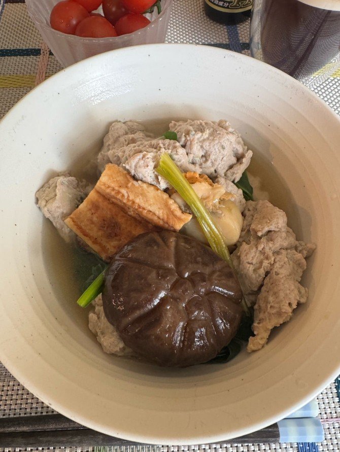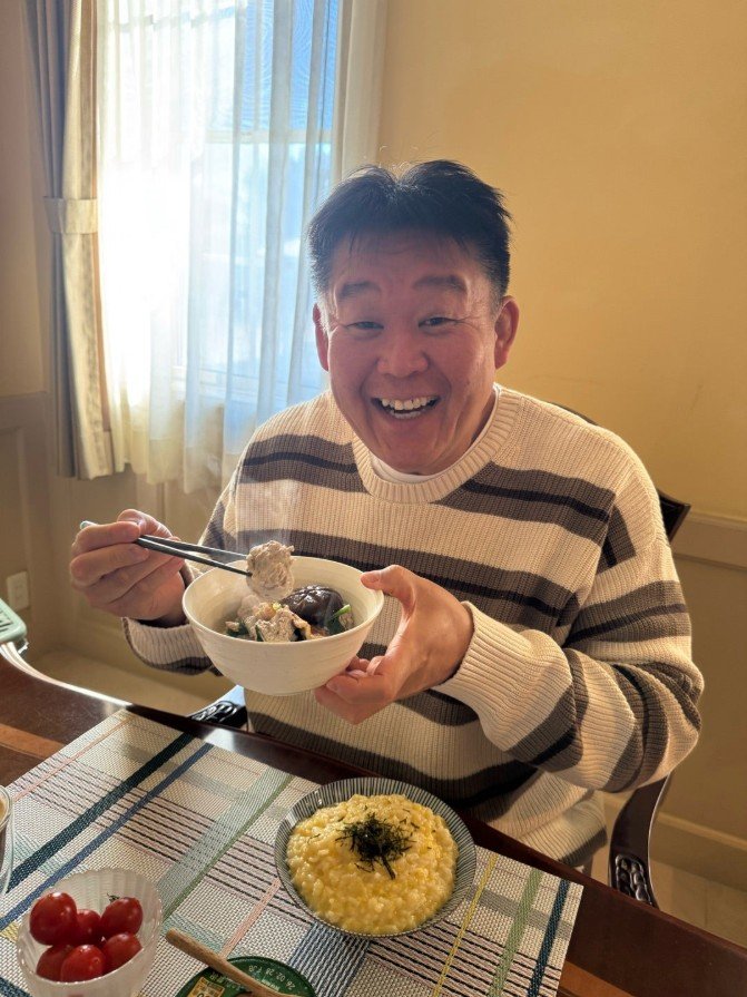 窓から差し込む柔らかな光の中、ダイニングで笑顔を見せる写真も公開されており、特にお気に入りの魚のつみれについては「最高です」とその満足感を綴っています。