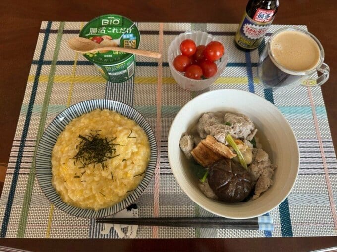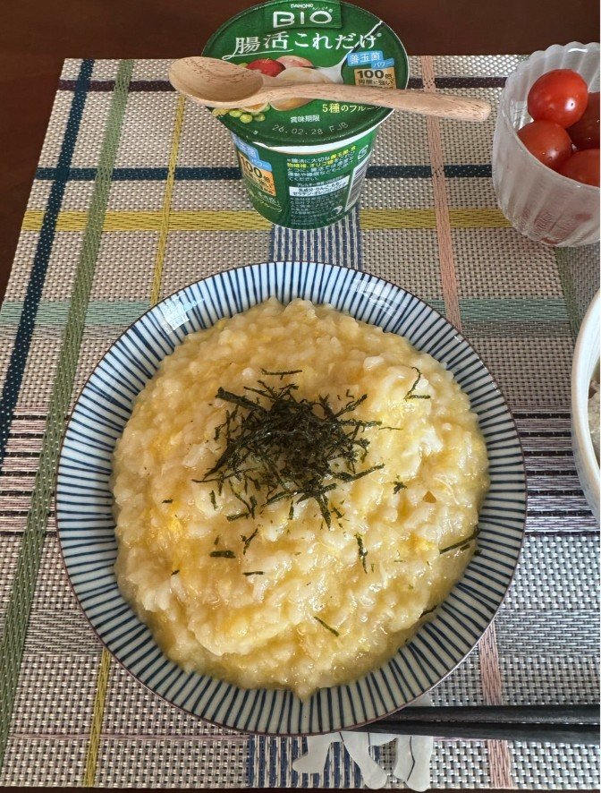 この日の朝食は「おじや、ヨーグルト、魚のつみれ汁」。テーブルには、卵でとろりと包まれ刻み海苔を散らしたおじやと、椎茸や野菜がたっぷり入ったつみれ汁が並び、ミニトマトが彩りを添えています。