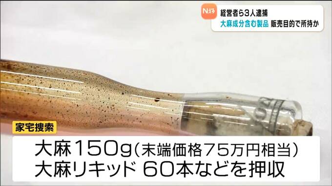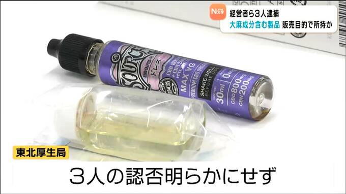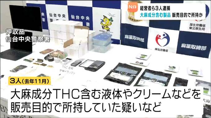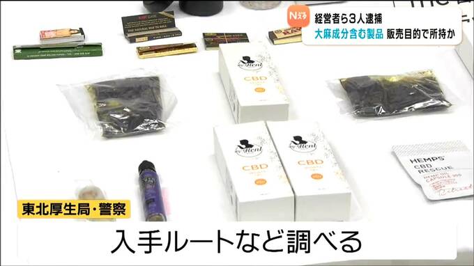 大麻成分を含む製品を販売する目的で所持していたなどとして仙台市内の販売店の経営者の男ら男女3人が逮捕されました。店からは大麻などが押収されました。