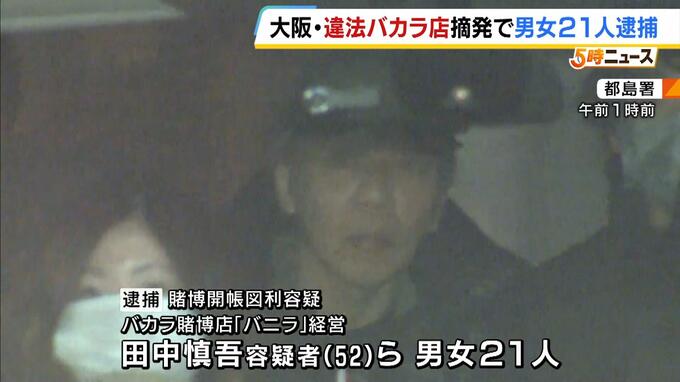 警察が大阪・ミナミの違法なバカラ店を摘発し男女21人を逮捕しました。 逮捕されたのは、大阪市中央区東心斎橋のバカラ賭博店「バニラ」を経営するグループのトップ、田中慎吾容疑者(52)ら店の関係者の男女…