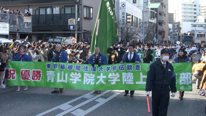 今年の箱根駅伝で総合優勝を果たした、青山学院大学の優勝パレードが、きのう(25日)行われ、岡山市出身で主将の黒田朝日選手らが声援を受けました。