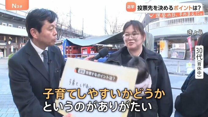 「子育てしやすいかどうかというのがありがたい。保育園に入りやすくしてほしいのと、仕事をしている方とかは時短とかで働いている方もいる。保障も手厚くしてほしい」