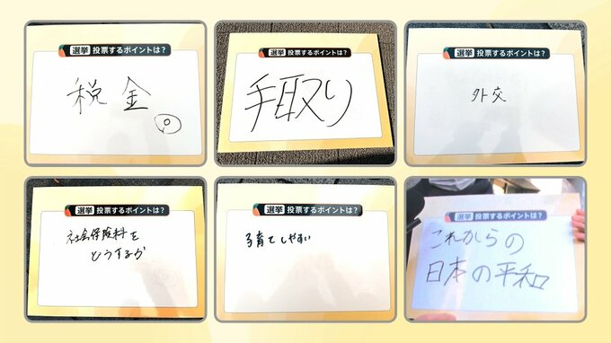 投票先を選ぶポイントについて街できいてみると、▼税金、▼手取り、▼外交、▼社会保険料、▼子育て、▼日本の平和など、さまざまな争点が挙がりました。