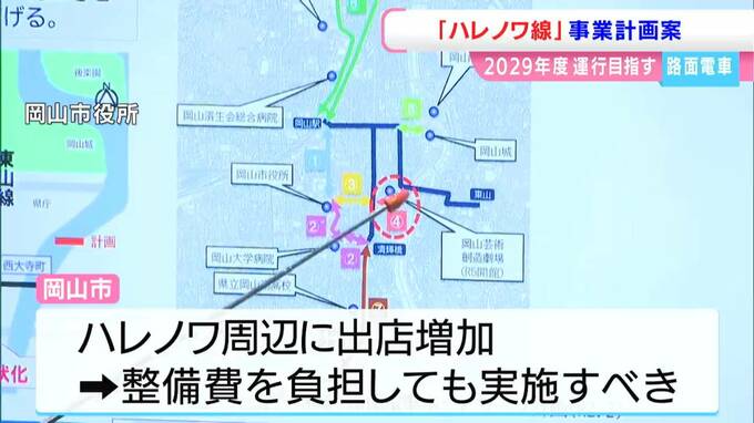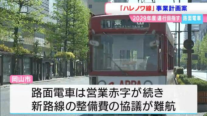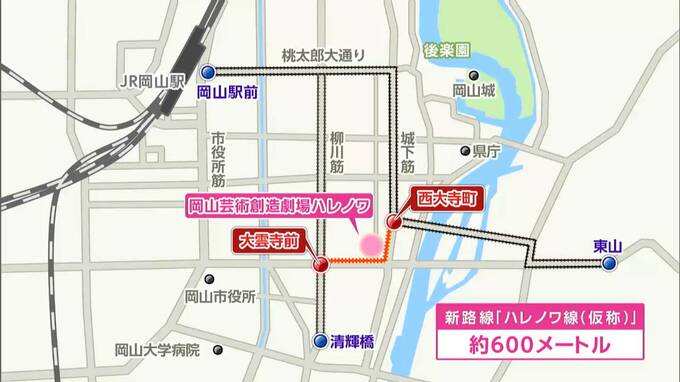 岡山市は、市中心部を走る路面電車の新路線、「ハレノワ線(仮)」の事業計画案をまとめました。岡山芸術創造劇場・ハレノワ周辺の活性化を目指し、2029年度の運行開始を目指すとしています。