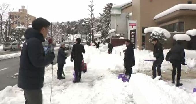 記者リポート「昨日から降り続いた雪が今朝も歩道に残っているため、たくさんの人が雪かきをしています」