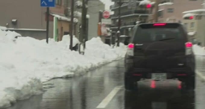 記者リポート「こちらの道路は普段2車線ですが、片方を雪が覆ってしまい、1車線しか車が通れません」
