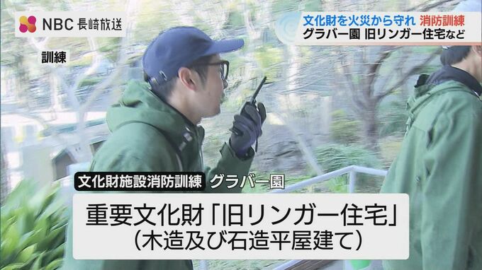 訓練は、グラバー園にある国指定の重要文化財「旧リンガー住宅」から火が出た想定で行われ、消防や園の職員ら35人が参加しました。