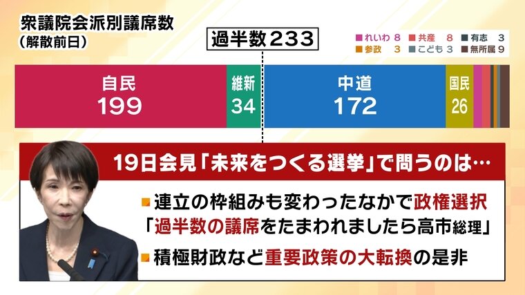高市総理は、今回の選挙の勝敗ラインを「自民・維新で過半数(233議席)を得ること」としています。自民党は高市政権発足にあたり公明党との連立を解消し日本維新の会と新たな連立の枠組みを構築しましたが、この連立体制への真意を問いたい考えです。