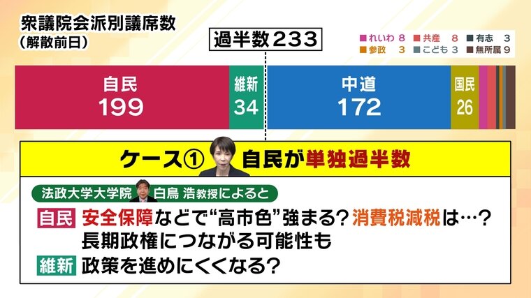 もし自民党が単独で過半数を超える議席を獲得=圧勝した場合、「高市総理は自身の掲げる政策をより強力に推進しやすくなる」というのが白鳥教授の見解です。安全保障分野の強化も含めた「高市カラー」が前面に出る政権運営が加速するでしょう。