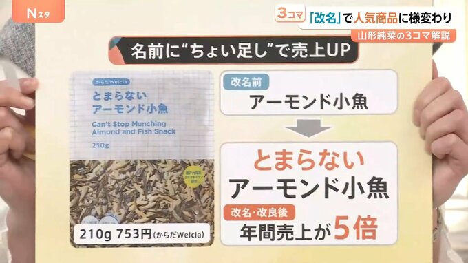 他にも名前にちょい足ししたという商品があります。からだWelciaの「アーモンド小魚」という商品は、名前を「とまらないアーモンド小魚」に改名・改良したところ、年間売上が5倍になったということです。