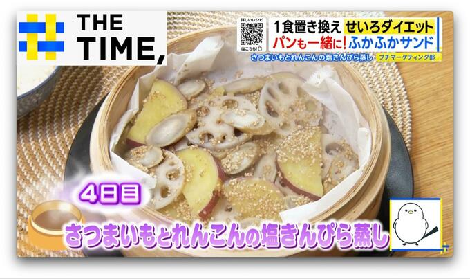 4日目は、仕上げにまわしかけるごま油が香ばしく食欲をそそる【さつまいもとれんこんの塩きんぴら蒸し】。ご飯と汁物も一緒に食べてOKです。