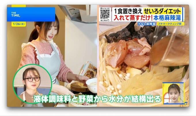 3食のうち1食をせいろレシピにするだけという“手軽さ”と、開ける時の“わくわく感”で続けやすいのが魅力とのことで、羽田部員と、“高度肥満”の番組男性スタッフの2人が「7日間のせいろダイエット」を実践してみることに。