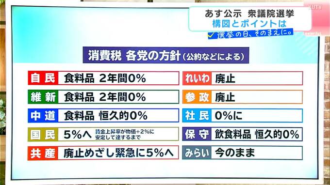 例えば、「消費税」についての各党の公約をまとめると、以下のようになっていて、各党は私たちの暮らしに関する公約を全面的に打ち出しています。