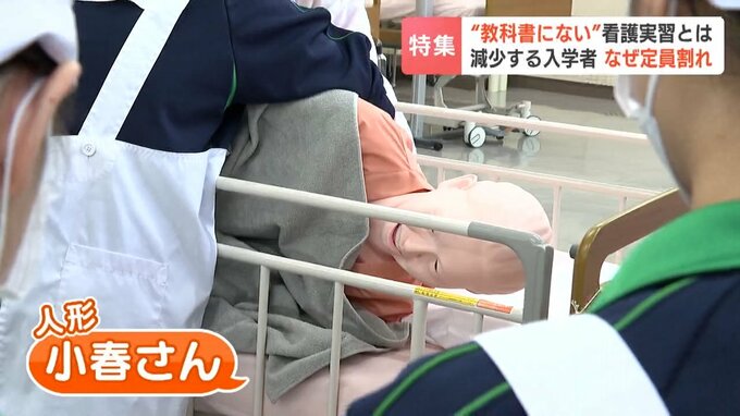 排泄の介助では、精密につくられた人形「小春さん」を相手に便にみたてた味噌を使って、手順や声掛けをていねいに確認します。