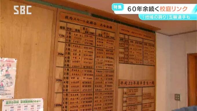 毎年開かれている記録会。壁に並ぶ歴代の記録は、子どもたちの目標です。