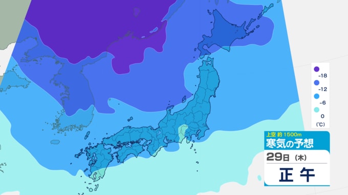 【27日(火) 06時00分】 気象庁によりますと、今週後半の29日(木)から30日(金)にかけて、再び強い冬型の気圧配置となり、今季最強クラスの寒気が南下する見込みです。