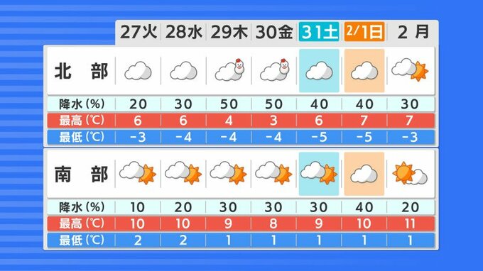 夜からは、再び西高東低の冬型の気圧配置となります。木曜日から金曜日にかけて寒波のピークとなる見込みです。先週と比べると極端な寒さにはならないものの、朝晩を中心に凍える寒さとなります。万全の防寒対策をしてお過ごしください。