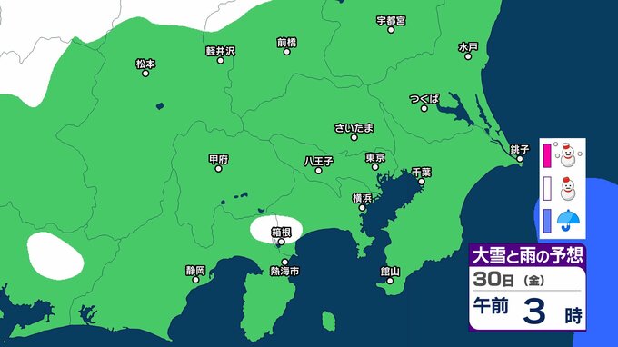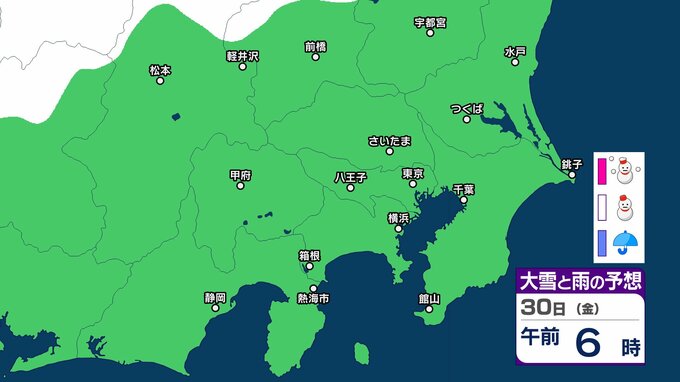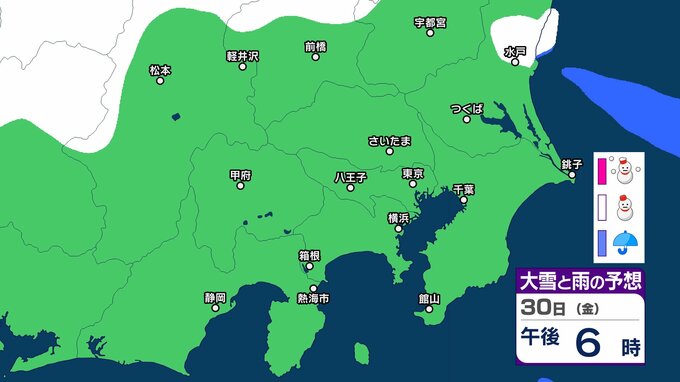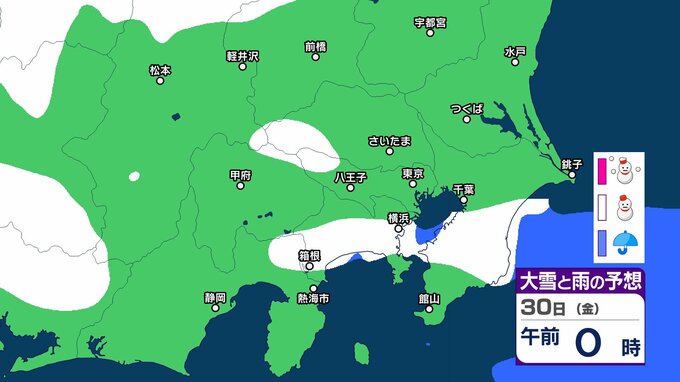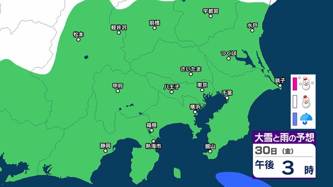 【東京の雪予想】29日・30日は横浜・千葉・東京など首都圏に雪雲も…いつどこで降る?東京、横浜、千葉、埼玉、つくば、栃木、群馬、山梨【気象庁 27日(火)~2月1日(日)の雪雨シミュレーション】 RSK山陽放送 2026年1月27日(火) 09:25 国内 30日(金) 気象庁は、29⽇から30⽇は、⽇本付近は冬型の気圧配置が強まると予想しています。 シミュレーションでは、静岡、神奈川、千葉、東京、埼玉、山梨、群馬、長野の一部地域に雪雲がかかっています。 ▶27日(火)~2月1日(日)首都圏の雪雨シミュレーション