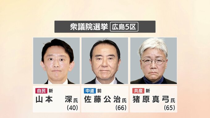 衆議院選挙が公示 広島では6つの小選挙区に計25人が立候補を届け出(午前9時半現在) 中国放送 2026年1月27日(火) 09:51 国内 広島5区は3人が届け出 【広島5区】 ▽自由民主党の新人、山本深(やまもと・しん)氏(40) ▽中道改革連合の前職、佐藤公治(さとう・こうじ)氏(66) ▽日本共産党の新人、猪原真弓(いのはら・まゆみ)氏(65) 以上の3人です。