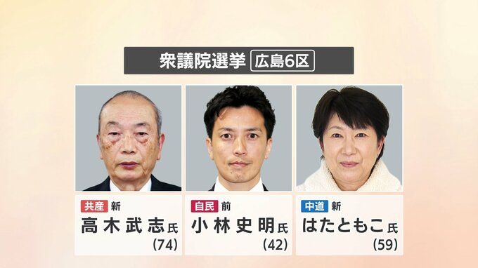 衆議院選挙が公示 広島では6つの小選挙区に計25人が立候補を届け出(午前9時半現在) 中国放送 2026年1月27日(火) 09:51 国内 広島6区には3人が届け出 【広島6区】 ▽共産党の新人、高木武志(たかぎ・たけし)氏(74) ▽自由民主党の前職、小林史明(こばやし・ふみあき)氏(42) ▽中道改革連合の新人、はた ともこ氏(59) 以上の3人です。