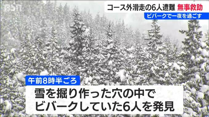 警察と消防などは26日午前6時半に捜索を開始。その後、午前8時半過ぎに雪を掘って作った穴の中で、ビバークしていた6人を発見したということです。