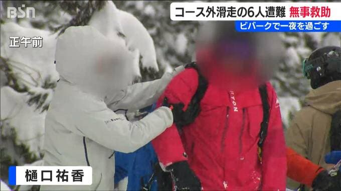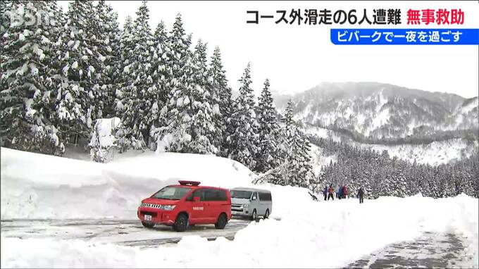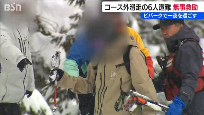 新潟県南魚沼市のスキー場付近で25日、コース外を滑走していたとみられるスノーボーダー6人が遭難しました。6人は26日午前、捜索隊に救助されました。6人ともけがはありませんでした。