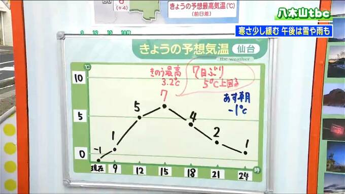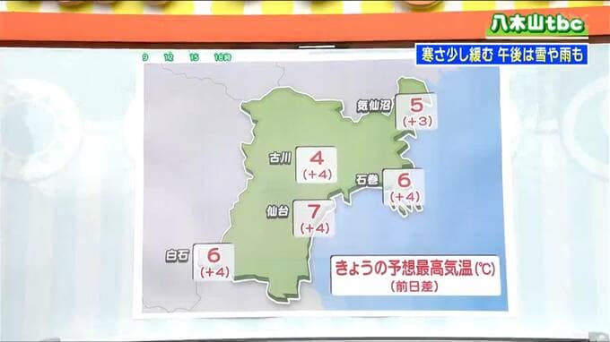 気温のグラフから見ると、最高気温のピークは昼過ぎ、午後2時から3時ぐらいに観測されるでしょう。仙台では7日ぶりに5℃を上回りそうで、日差しの下では少しだけ暖かさも感じることができそうです。ただし、午後は風も出てきそうですので、その風が冷たく感じられる時間帯もあります。体調の管理には今日も注意が必要です。