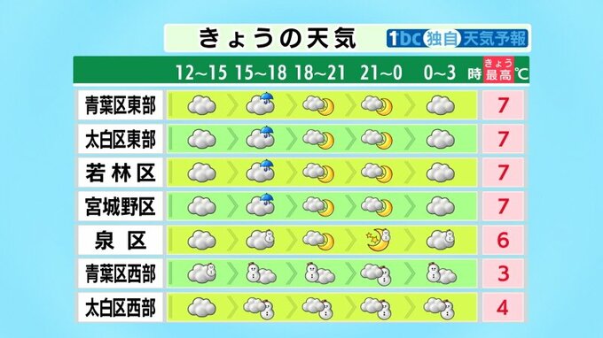 ■青葉区東部:7℃ ■青葉区西部:3℃ ■若林区:7℃