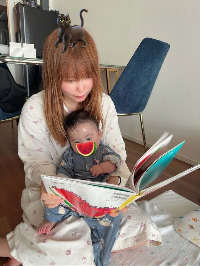 投稿された写真では、赤ちゃんを膝に乗せて絵本を読む姿を披露。「寝起きすっぴんボサボサ頭で読み始めたからすみません」とコメントしつつ、「すごく集中したりニコニコしてくれるから読み甲斐がある 童謡うたったりも 楽しいから自分自身のリハビリにもなってる感じがする」と綴っています。