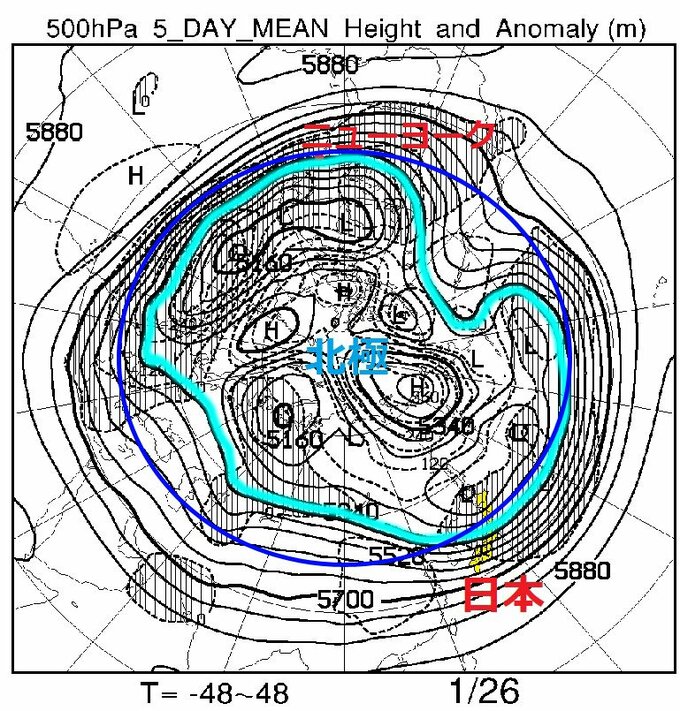 日本列島にはまさにその通り「最長寒波」がやってきていて、上空5500メートル付近の大気の状態を表した図を見ると、日本付近で偏西風が南に下がっているのと、大寒波に見舞われている北米の東海岸付近でも同様に偏西風が蛇行し南下している様子が見てとれます。