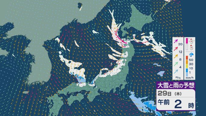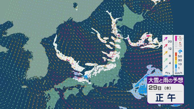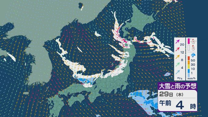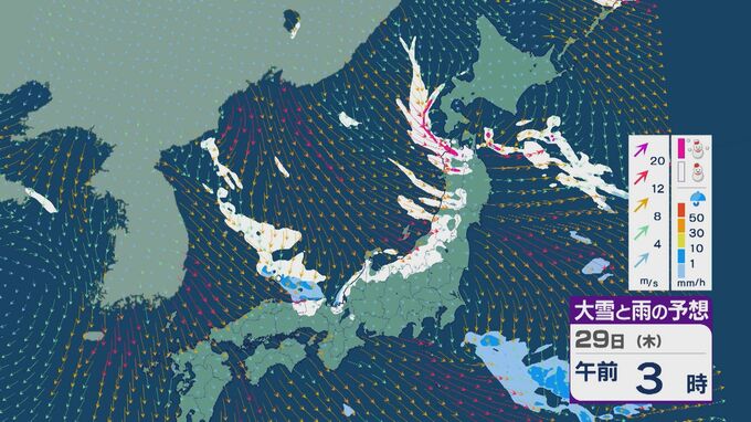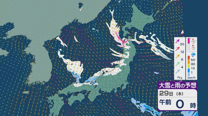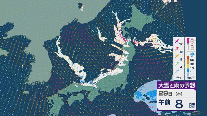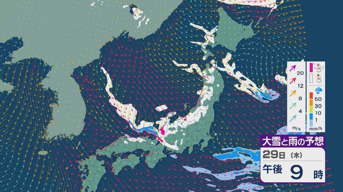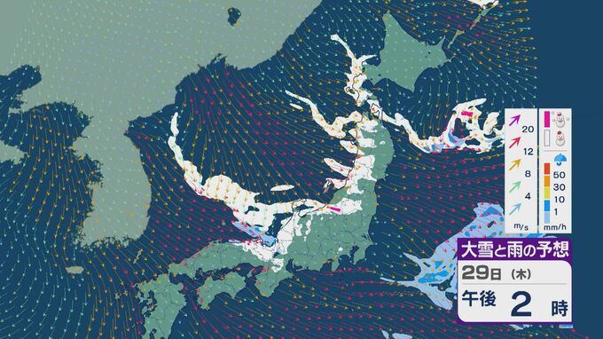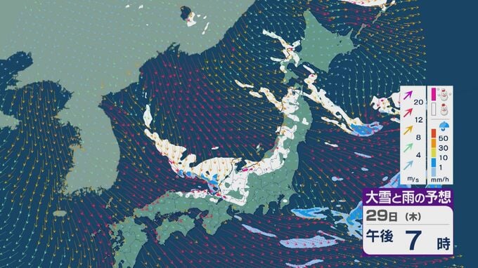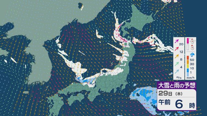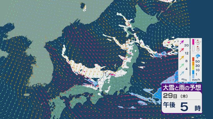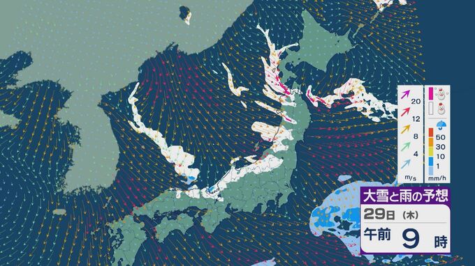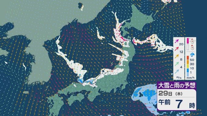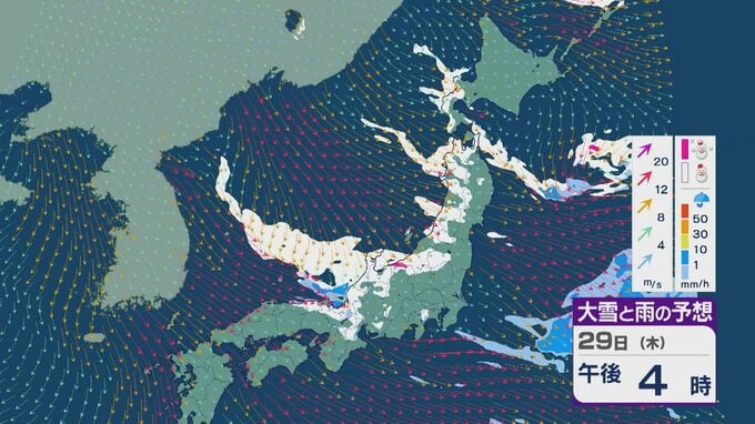 【大雪情報】日本海側は荒れる週の後半に 28日(水)以降“冬型気圧配置”と“強い寒気”が到来 発達した雪雲が北陸などに流れ込むおそれ 積み重なる雪に注意・警戒を 雪と風シミュレーション 北陸放送 2026年1月27日(火) 13:05 国内 29日は、発達した雪雲が山陰から北陸、東北の日本海側にかかりそうです。風が収束し発生する雪雲が流れ込むところでは大雪のおそれがあります。 夜遅くには、福井県などで雪の降り方が強まるおそれがあります。