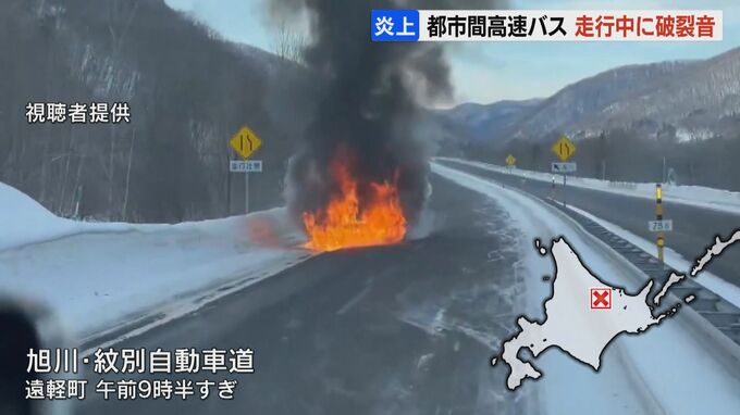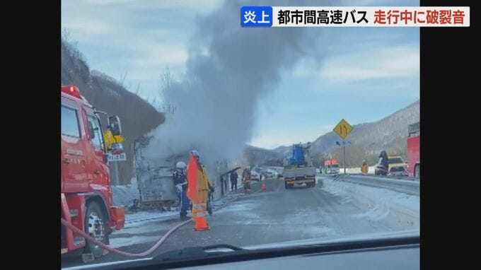 運行会社によりますと、走行中にエンジンルーム付近から「パン」という破裂音が聞こえ、運転手がミラーで炎を確認し、すぐに停車したということです。