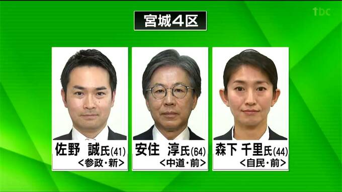 【衆議院選挙】2月8日投開票に向け公示 5選挙区に21人立候補 宮城 東北放送 2026年1月27日(火) 12:07 国内 宮城4区 宮城4区には届け出順に 参政党の新人・佐野誠氏41歳 中道改革連合の前職・安住淳氏64歳 自民党の前職・森下千里氏44歳 の3人が立候補しました。